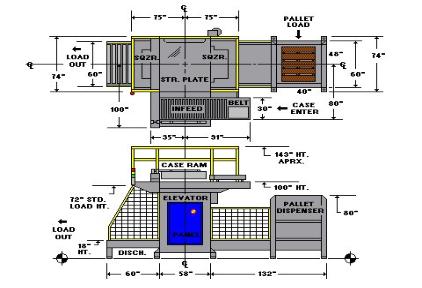 STANDARD FEATURES -SELF TRACKING INFEED METERING BELT - PNEUMATIC OPERATED FLIP-UP CASE RAM - BI-PARTING (SPLIT) STRIPPER PLATE - LAYER FORMING CASE GUIDES - AUTOMATIC PALLET SWEEP DISPENSER - POWERED ELEVATOR ROLLERBED - 5' POWERED DISCHARGE CONVEYOR - SUMITOMO MOTOR GEAR DRIVES - ALLEN BRADLEY PLC CONTROLLER - ALLEN BRADLEY TOUCH SCREEN CONTROL - ALLEN BRADLEY PHOTOCELLS & SENSORS - MAC PNEUMATIC VALVES - NEMA 12 PANEL CONSTRUCTION ( HIGH SPEED MODEL HP ALSO AVAILABLE ) |
